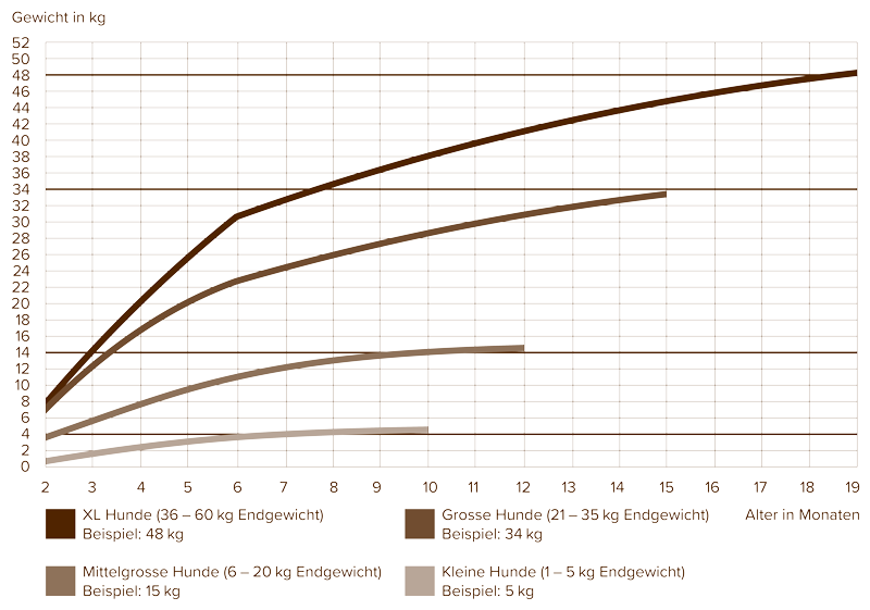Non si deve nutrire un cane con cibo per cani adulti fino a quando il cane non è completamente cresciuto. Le razze piccole sono completamente sviluppate a circa 10 mesi di età, le razze medie a 12 mesi e le razze grandi e giganti a circa 18-24 mesi. Nel primo semestre si verifica il maggior aumento di peso e di dimensioni. Per informazioni più dettagliate, chiedi all'allevatore o all'associazione della razza le fasi di crescita del giovane cane.